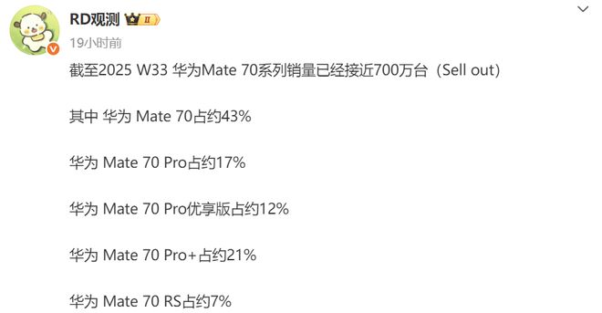 据悉,截至2025年第33周,华为Mate70系列销量已经接近700万台大关,这一数字即使对于高端旗舰机型来说也相当惊人。