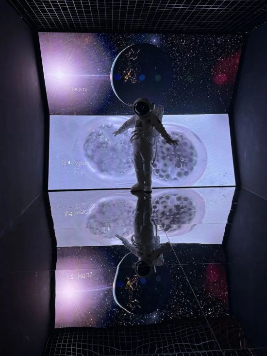 B馆“可至之境”呈现了星际桥梁、虫洞、黑洞视界、宇宙的尽头、共创宇宙等七大展区,超真模拟异星等场景,真实还原太空实景,带领观众沉浸式感知宇宙。