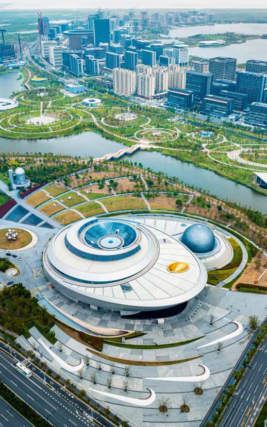 临港滴水湖畔,上海天文馆主建筑以优美的螺旋形态模仿天体运行轨道,使参观者在入馆前便能感受宇宙的奇妙。