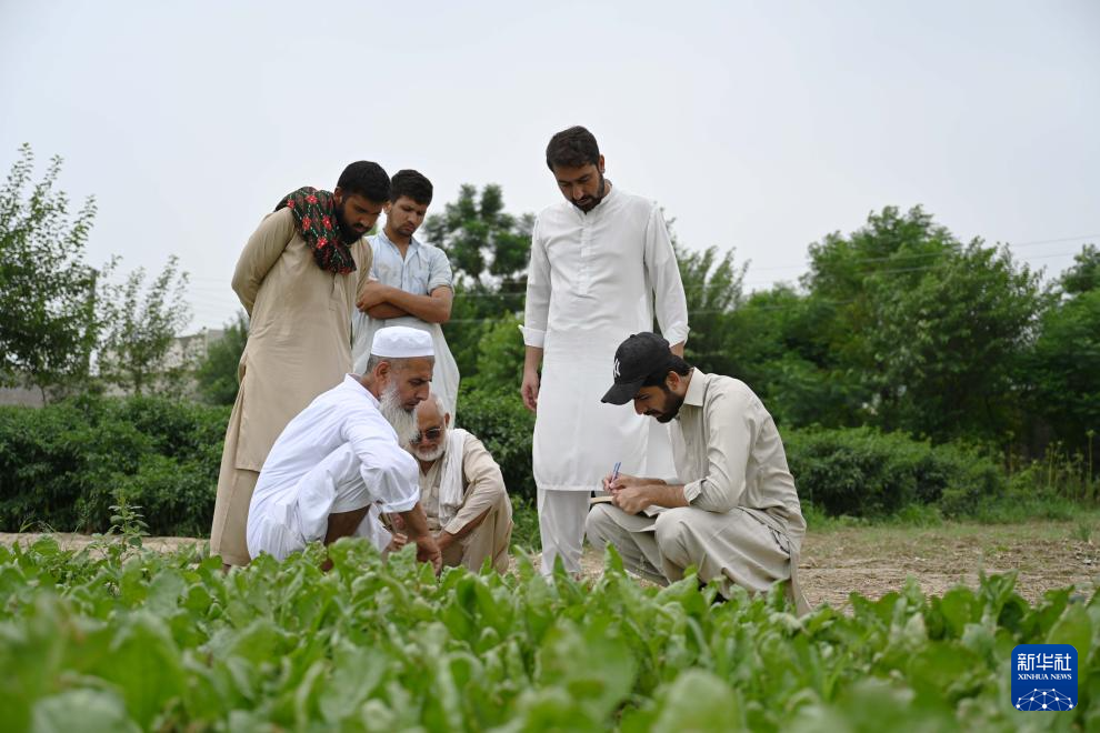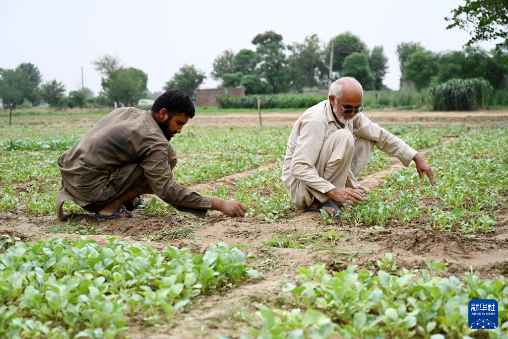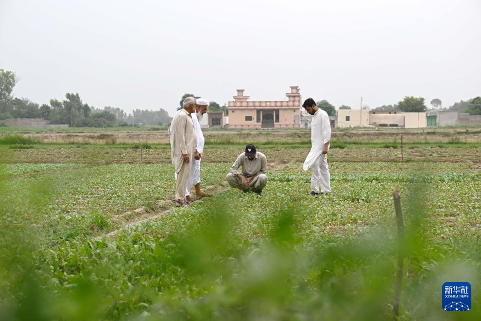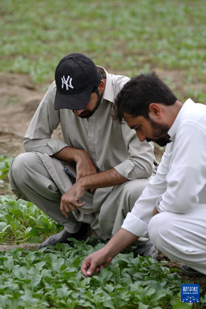 8月13日,在巴基斯坦东部旁遮普省阿塔克县,农民·萨夫达尔(右)查看农田中引进自中国天津的花椰菜苗。新华社发(达尼亚勒·汗·贾敦摄)