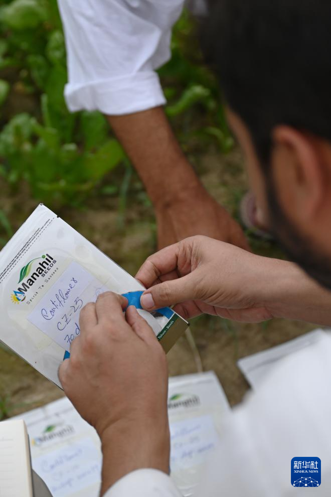 8月13日,在巴基斯坦东部旁遮普省阿塔克县,巴基斯坦农业技术人员查看引进自中国天津的花椰菜种。新华社发(达尼亚勒·汗·贾敦摄)